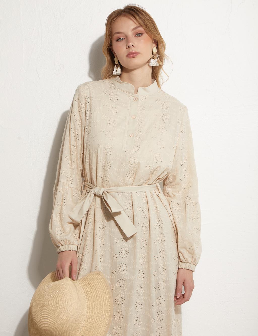 Embroidered dress with waistband in cream