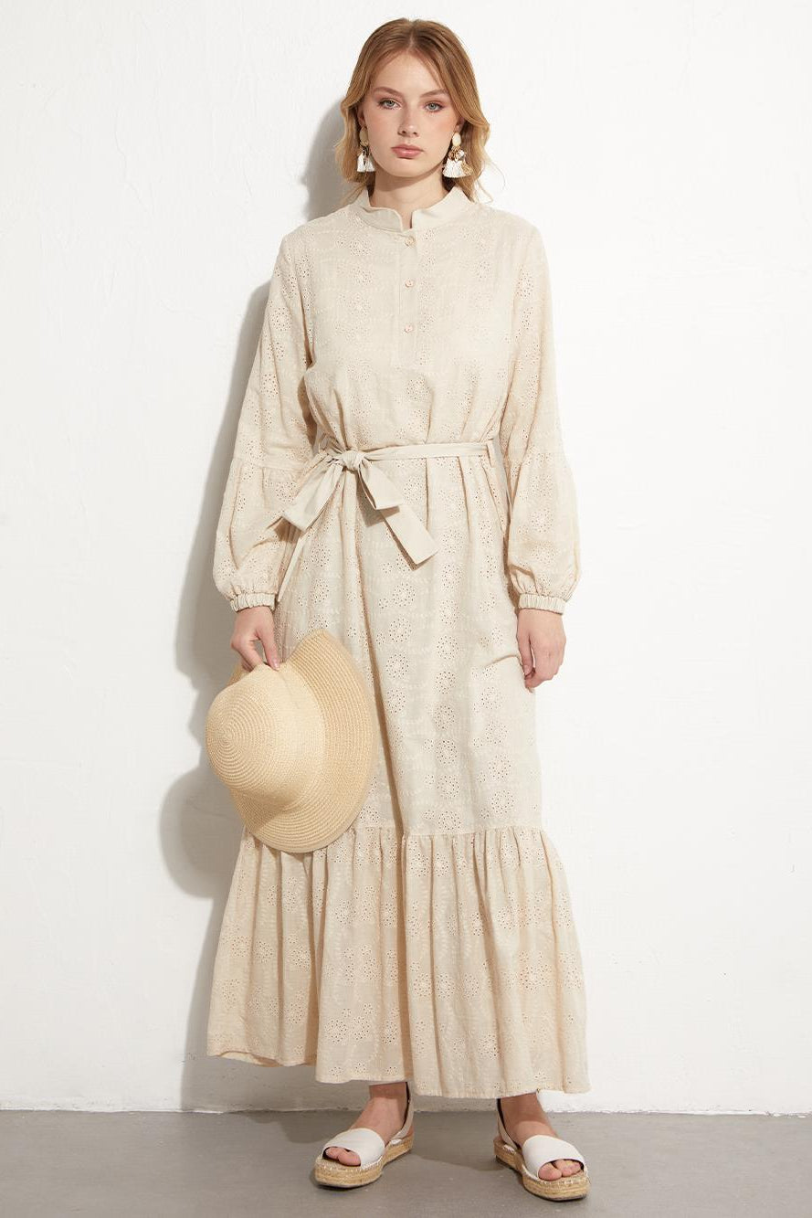 Deze elegante jurk met ceintuur combineert stijl en comfort in één ontwerp. De ceintuur accentueert de taille, terwijl de fijn geborduurde lange rok zorgt voor een moderne, verfijnde look. Perfect voor vrouwen die op elk moment van de dag elegantie willen uitstralen. Combineer met een tas, oorbellen en accessoires voor een complete outfit.