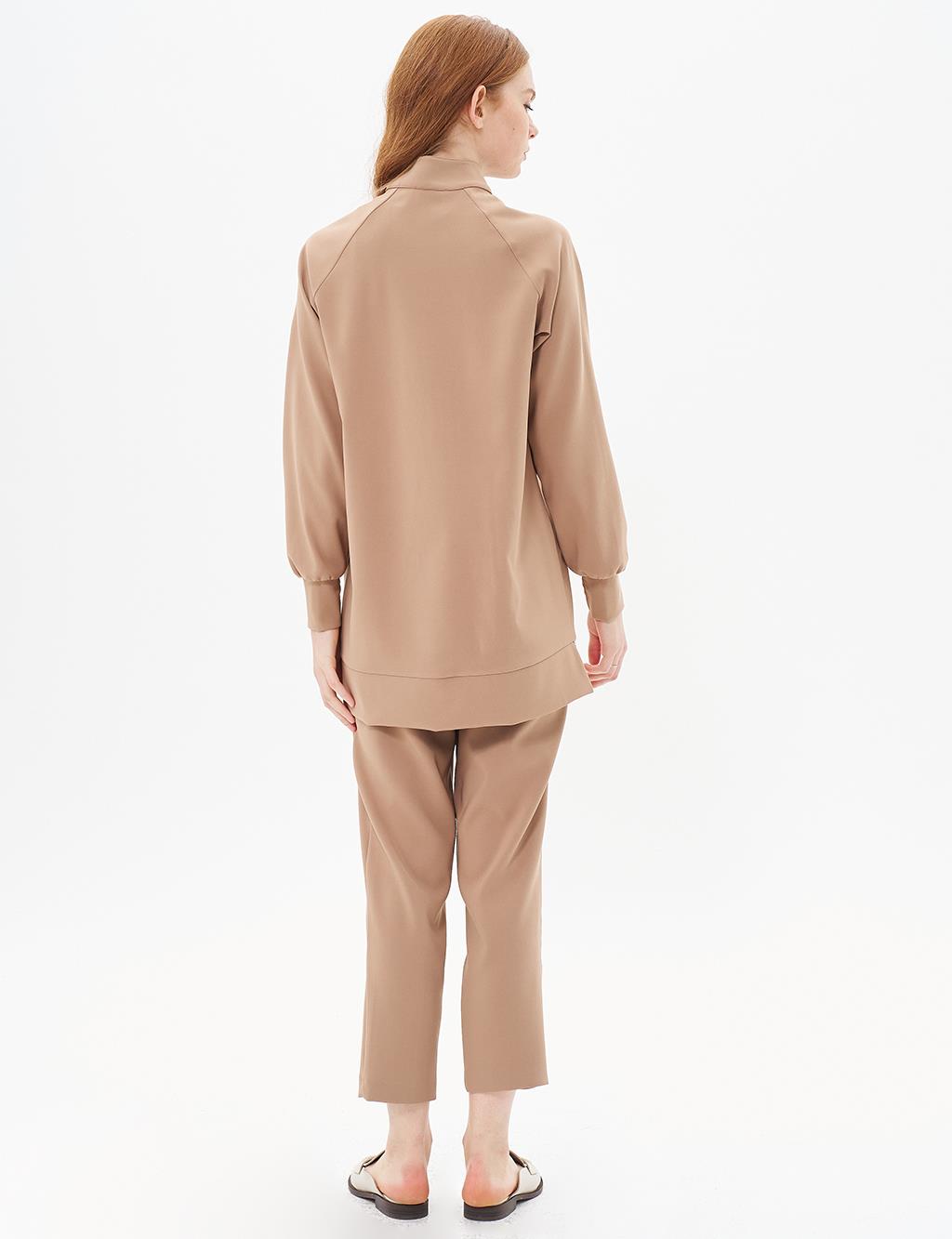Coltrui, raglanmouwen, zijbuttonsluiting en geplooide manchetten tuniek. Hoge taille, doorgestikte, taps toelopende broek met zijritssluiting. Dit is een tweedelig set bestaande uit een tuniek en broek.